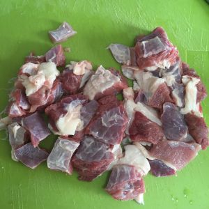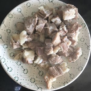 牛腩切块,用刀背多拍几下,把肉打散。这样会比较容易嚼烂。