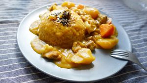 盛上一碗饭倒扣盘中,将咖喱牛腩浇至饭上。根据个人喜好撒点熟芝麻即可享用了。