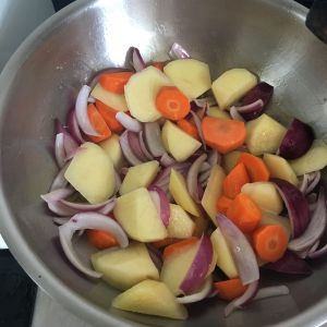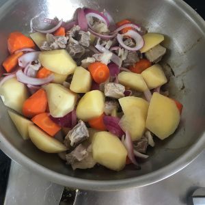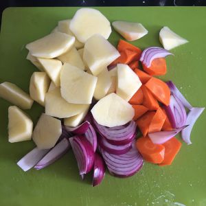 土豆胡萝卜滚刀切块,洋葱切片。