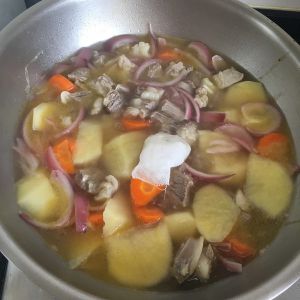 看咖喱块都化了即可关火。咖喱块里本身就带咸度,我一般都不会再放盐了。口重的可适当加盐。