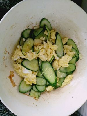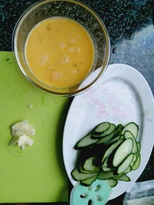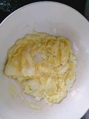 10g油烧开,把鸡蛋煎至半熟,关火,用余温炒熟鸡蛋,刚熟的那种,盛出备用