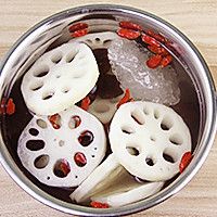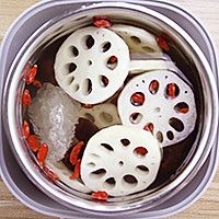 将阿胶枣、冰糖、枸杞、清水放入装有莲藕的内胆中