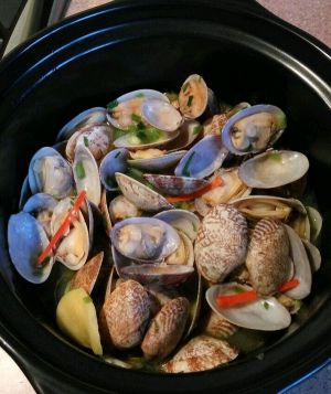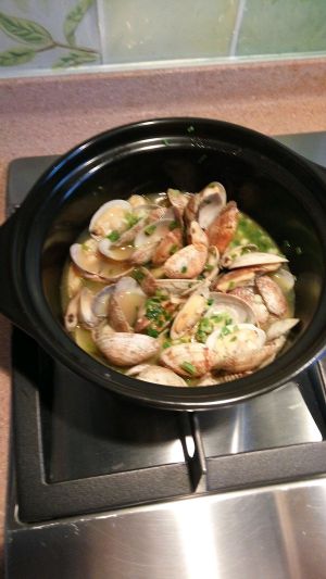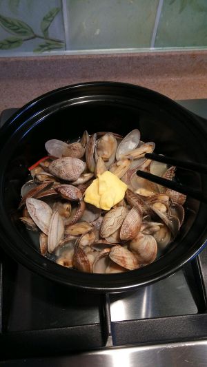 盖锅盖焖煮6、7分钟,等蛤蜊全部开口