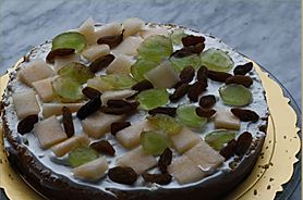 然后铺上橙子片盒和葡萄片 洒入巧克力彩珠