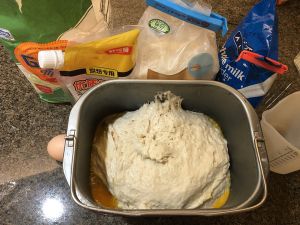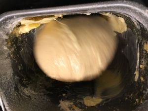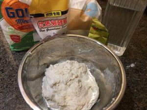 将发酵好的酵头和主面团除黄油外的材料混合,用机器揉至面团表面光滑(大概15分钟)