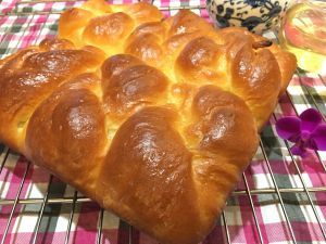 180度烤箱下层,上下火,烘焙30分钟左右。出炉后立刻在面包表面刷融化的黄油,脱模。