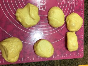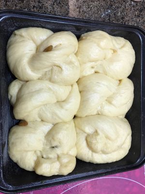 摆入烤盘,放入温暖潮湿的地方(我通常是准备一盆开水,然后把要发酵装盘的的面包一同放入烤箱里)