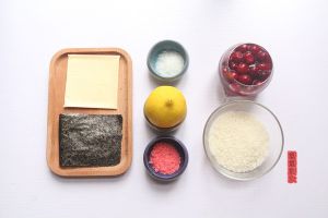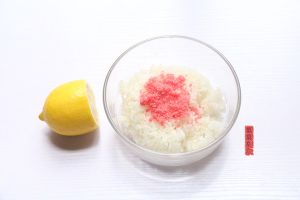 米饭煮好后,趁半热挤入柠檬汁和樱花粉拌匀,这里不用加醋是因为樱花粉和柠檬汁及蔓越莓酱带出的口感更清馨。