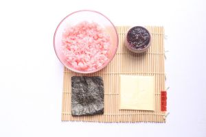底部铺上保鲜膜,在米饭中间放入蔓越莓酱和芝士片捏成一个三角形状。