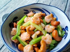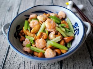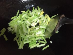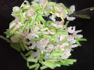 然后加入腌好的虾仁,爆炒至变色,加一点盐调味,喜欢的话还可加一点糖提鲜