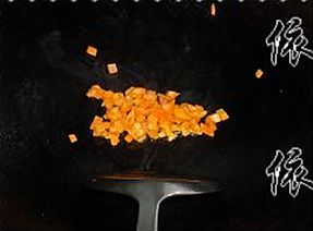 热油锅,放进胡萝卜丁炒至软身;