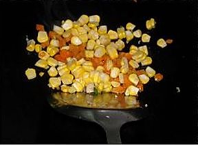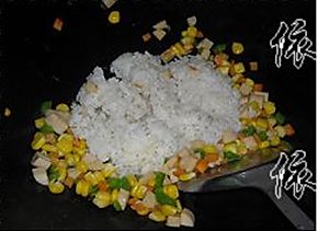 加入玉米粒,边炒边洒水,炒1分钟;