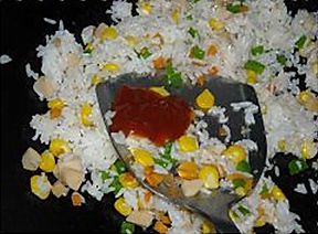 把所以材料炒干身,加入1汤匙的番茄沙司,翻炒均匀;