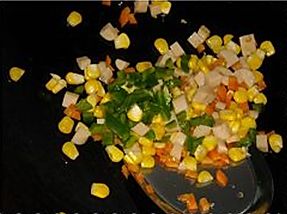 加入青椒粒炒,翻炒均匀,放少许盐调味,放盐不要太多,应该比平时吃的味道淡一点,因为奶酪有咸味的;