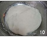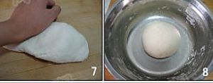在盆的表面盖上一层保鲜膜,放在室内温暖的地方,自然醒发约1小时。醒发好的面团,比原来大约膨胀1.5倍,将面团用手压扁。