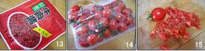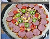 将圣女果碎与肉酱混合后,均匀的涂抹在饼皮上,然后可依次铺上马苏里拉奶酪丝,火腿片,玉米粒,青椒圈。
