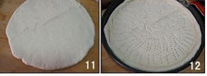 用擀面杖将面团擀成一个圆形面皮。将面皮放在比萨盘中,用手将面饼整形成与比萨盘同等大小,四周略厚的比萨饼皮。然后用叉子在饼皮上扎数个孔,静置10分钟