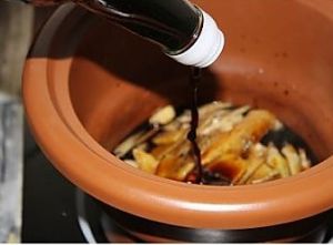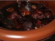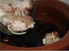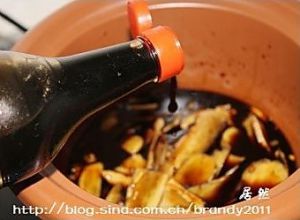 炒干的姜倒入砂锅,倒入两瓶甜醋,我妈妈说用了的是致美斋的甜醋,不含广告成分,她煲了几十年的猪脚姜,从便宜到鬼的都试过,觉得这个不错!