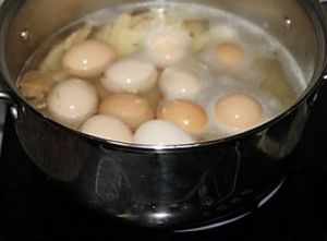把姜连水合着鸡蛋开始煲,直到煲滚后继续煲十几分钟!这一步是为了让姜去辣,吃起来很容易入口,接受!
