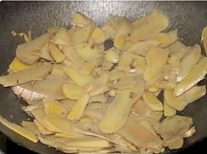 把姜倒入锅内,不要放油,中小火炒至干水,这一步是为了让姜一直保持爽口的秘诀!