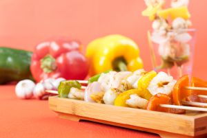 穿串:用竹签依次穿上红彩椒块、扇贝肉、黄彩椒块、虾仁、洋葱、扇贝肉、青彩椒块;将串好的海鲜串两面及烤架上各刷上一层色拉油,再将海鲜串放在烤架上。