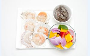 切配:将三色彩椒将洗净后,分别均匀切成8片;洋葱洗净后,切成与青椒大小相同的8块(多的放在一旁留作其他菜用);将虾洗净后去头、剥壳,并用牙签挑出肠泥;将扇贝洗净后,用小刀从扇贝壳中挖出鲜贝肉,然后横切成两段。