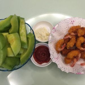下油锅炸虾(先大火烧热油,再改小火炸),配上沙拉酱、蕃茄酱,特别好吃