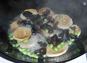 加入毛豆、黑木耳、盐烧五分钟,最后加鸡精、胡椒粉调味就可装盘啦。一盘清淡素鸡上台啦。(如可味重可加酱油,辣椒,跟据自已口味加哈)