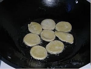 锅里油比平时炒菜多点,放入素鸡煎至二面金黄。