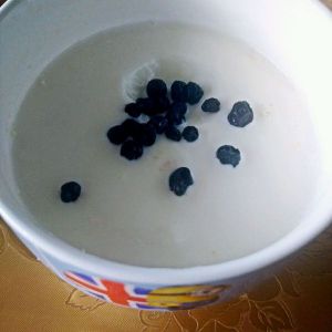 蛋清打到起泡泡,倒入凉牛奶和白砂糖迅速搅拌均匀(注意牛奶到出时用筷子隔下奶皮,并在碗里留一部分牛奶,防止奶皮粘碗)然后再把调好的牛奶沿着碗边倒回有奶皮的碗中,盖上保鲜膜,隔水蒸十分钟。蒸好后不要动,盖盖闷五分钟。再放冰箱冷藏两个小时撒入蓝莓干即可。