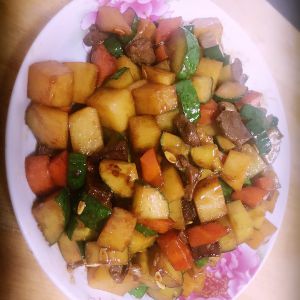 用香葱炝锅,放入牛肉粒翻炒,然后放入胡萝卜和土豆,最后放黄瓜。将蔬菜炒的差不多,放入酱油,放入白糖和老抽,老抽一点就可以了。最后放入少许盐即可。