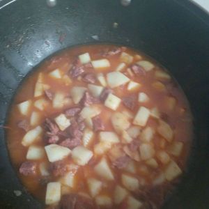 我用的是袋装可以直接吃的熟牛肉一袋,切小块,土豆番茄切块。