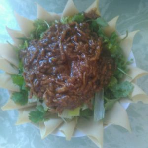 然后就是制作肉酱,热锅凉油,加入腌制好的肉丝,反复翻炒,然后加入农村大酱,这里也可以加甜面酱或者酱油,炖一会儿出锅
