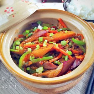 稍微大点火烹入料酒,下茄子和胡萝卜丝,茄子多炒一会儿才会软,胡萝卜要油脂来溶解胡萝卜素。如果锅子火力不够可以烹少许水,盖盖子焖一下。