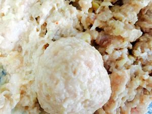 将搅好的肉藕泥搓成丸子掂实,呈光洁嫩滑的汤圆状。