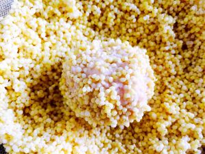 把肉藕丸分成两份,分别在沥干水分的糯米和小米中滚动,让丸子裹满糯米或小米。