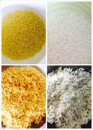 糯米和小米淘洗干净,提前泡3一一5小时沥干备用。