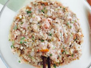 将肉泥和藕泥各半搅匀,加入所有调料,顺时针搅打上劲。