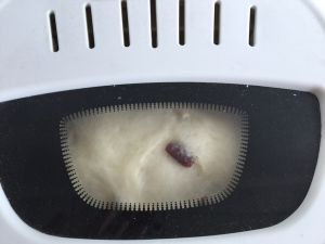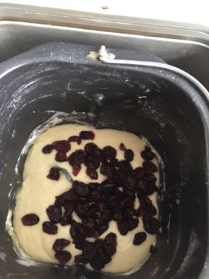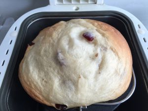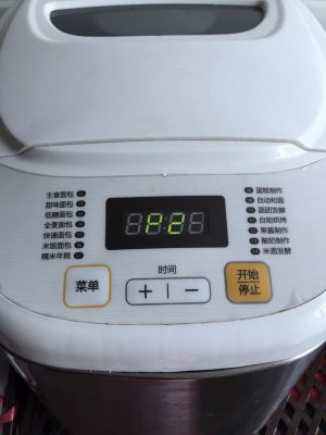将所有材料放入面包机,一次放入鸡蛋、水、白砂糖、奶粉、黄油、盐、高筋面粉、干酵母粉
