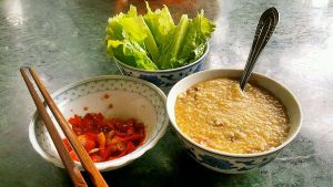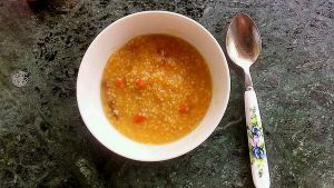 快要熬好的时候可放入几个泡好的枸杞, 继续搅动,直至完全熬煮好。建议和搭配比较爽口的酱菜吃