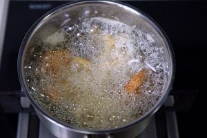中高温的油温炸鸡块至金黄色后取出,再用高温油复炸一次,取得酥脆的口感