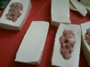 豆腐切块,中间挖洞填入拌好滴肉末
