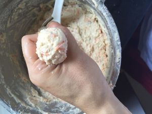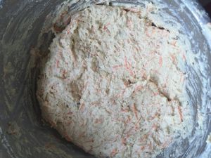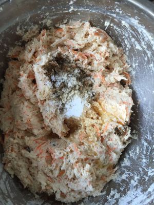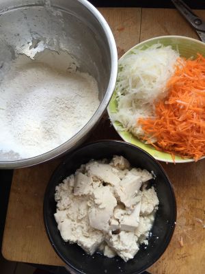 准备材料,豆腐捏捏碎,白萝卜、胡萝卜擦丝