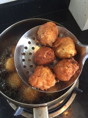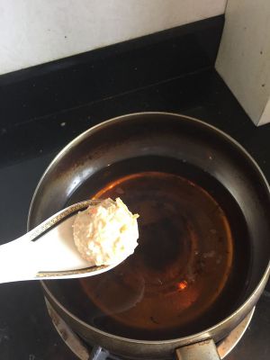 开始的时候先用高温,让丸子定型下,然后用中小火炸熟丸子内部,待丸子呈金黄色时即可用漏勺捞起控油