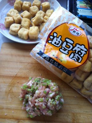 豆腐泡捅个洞,把拌好的肉馅填满豆泡