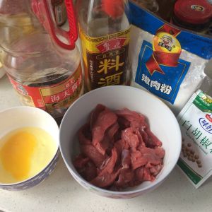 将牛肉切薄大片,用适量的料酒、生抽、白胡椒粉、蛋清、盐腌制15—20分钟左右。