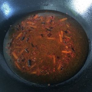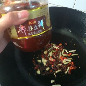 将适量的花椒、干辣椒、蒜蓉、葱头、郫县豆瓣酱 放入锅里用热油爆炒。