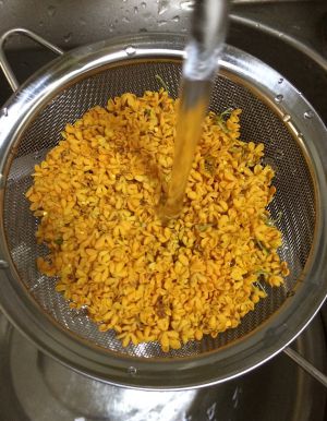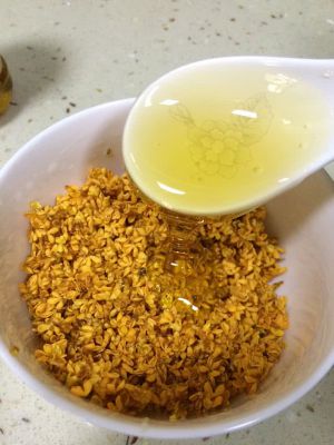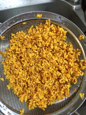 将新鲜桂花(最好选用金桂花,它特别香)放在滤网中,筛一筛,然后在用清水轻轻冲洗一下,以便去掉表面的灰尘。