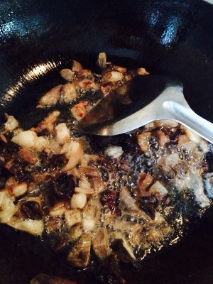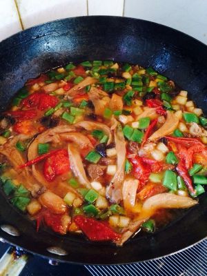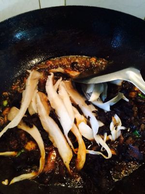 该放贺蘑、平菇了。过去只放贺蘑的,但现在贺蘑四、五百元一斤,只好放平菇来凑数,也不错。翻炒一、两分钟。