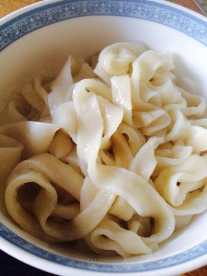 揉均匀面团,盖保鲜膜松驰30分钟,也就是醒面,醒到位呆会儿拉面时才不断。